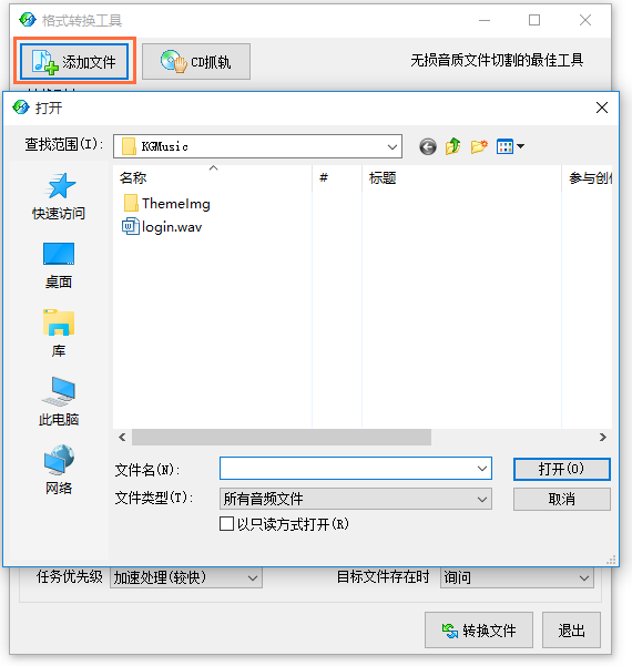 如图,点击【添加文件】,弹出对话框,选择音乐文件,