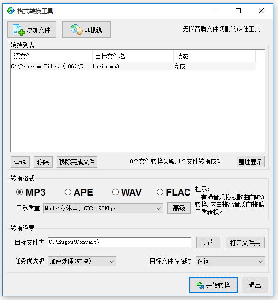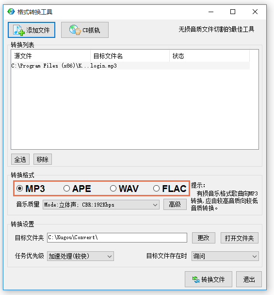 文件导入成功,选择转换目标格式,这里有MP3、APE、WAV、FLAC四种格式,我选择的是MP3,