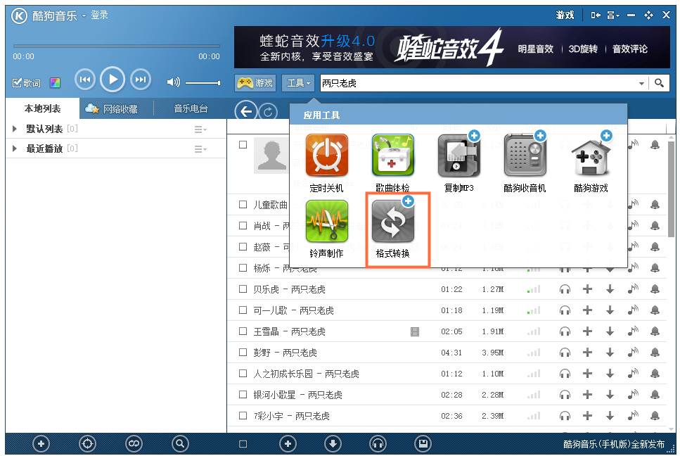 打开酷狗音乐2012,进入界面,如图,点击【工具】选想,在列表中选择【格式转换】,该功能目前呈现灰色,