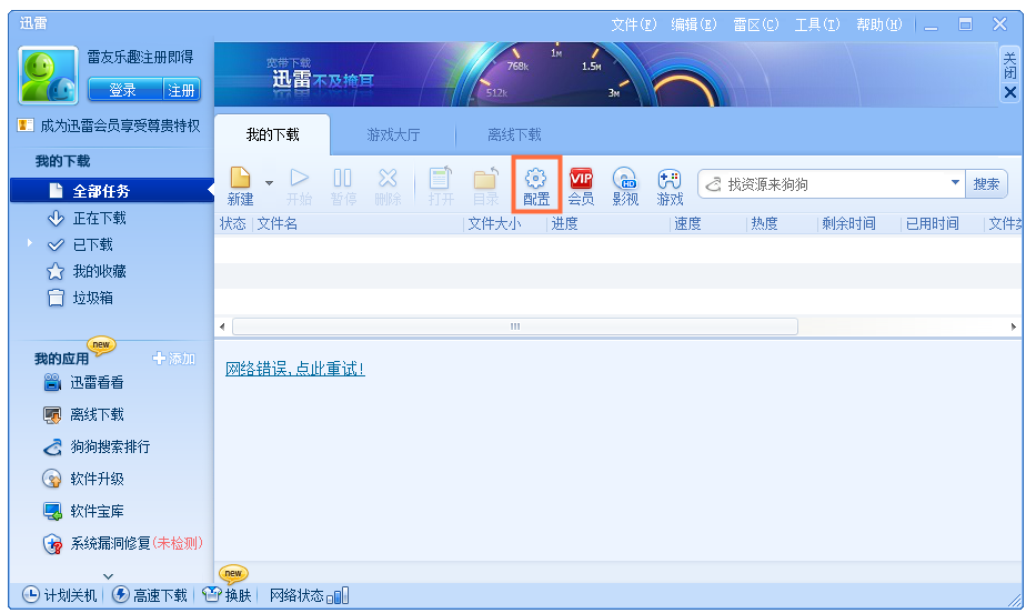 直接启动迅雷5,进入主界面,在工具栏中点击【配置】按钮,