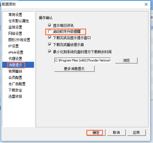 打开配置面板,点击【消息提示】,取消勾选【启动软件升级提醒】,确定,迅雷5就不会主动检测新版软件了。