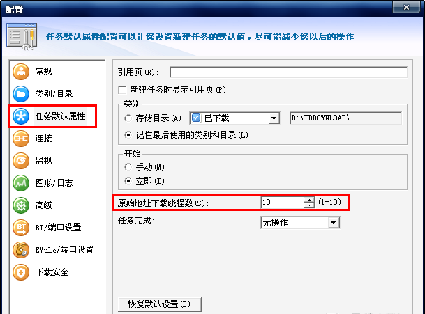 点击【任务默认属性】选项,修改【原始地址下载线程数】,设置数值为10,