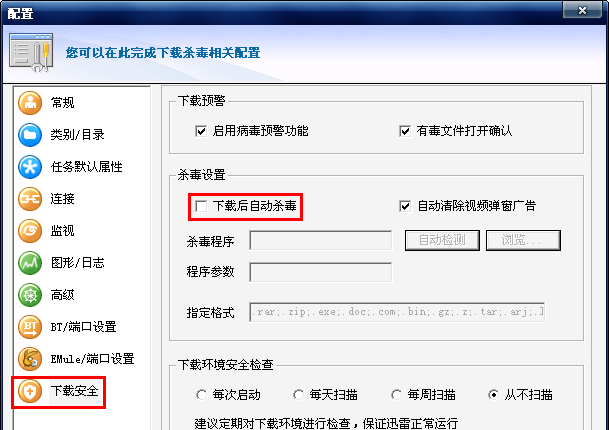 点击【下载安全】选项,取消勾选【下载后自动杀毒】,