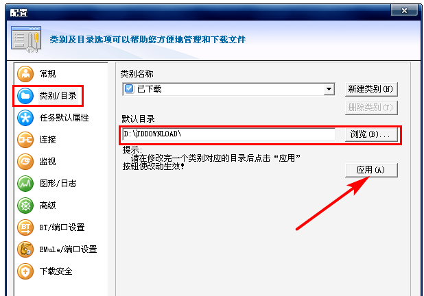 打开配置对话框,点击【类别/目录】选项,迅雷默认的下载位置在C:\\TDDOWNLOAD\\目录,将其进行修改,然后点击【应用】,保存更改,