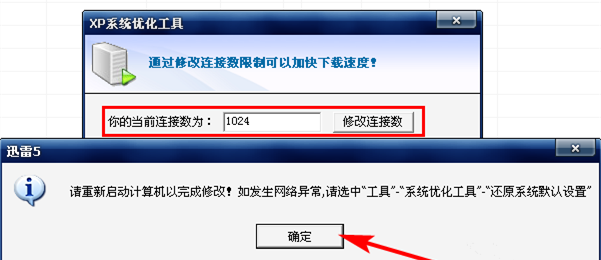 打开XP系统优化工具对话框,修改【你的当前连接数为】,改成1024,点击【修改连接数】按钮,确定,重启电脑,