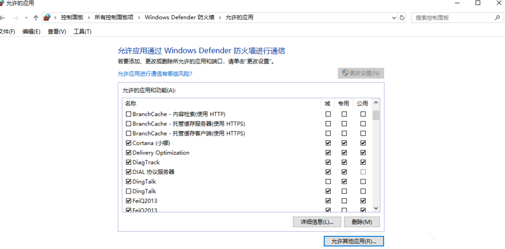 如图,点击【更改设置】,然后找到FeiQ2013.exe,进行勾选,点击确定,重新登录飞秋,即可正常接收信息。