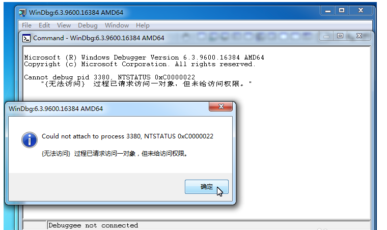 你可以使用管理员身份运行Windbg,重新选择一个进程,进行调试,
