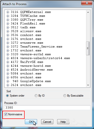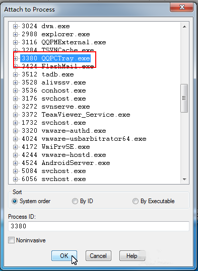 打开对话框,你可以看到本机所有的进程信息,如图,选择其中一个进程,点击OK,
