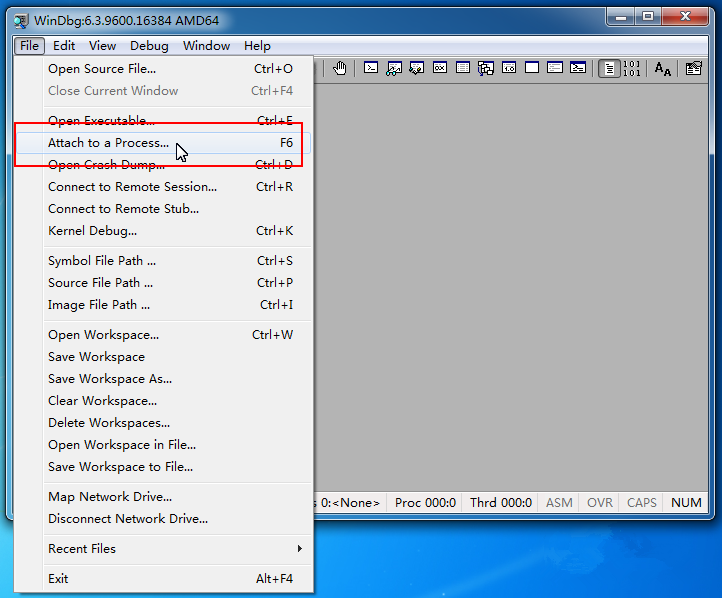 运行WinDbg,进入界面,如图,在菜单栏中点击【File】——【Attach to a Proces】,或者按F6键,