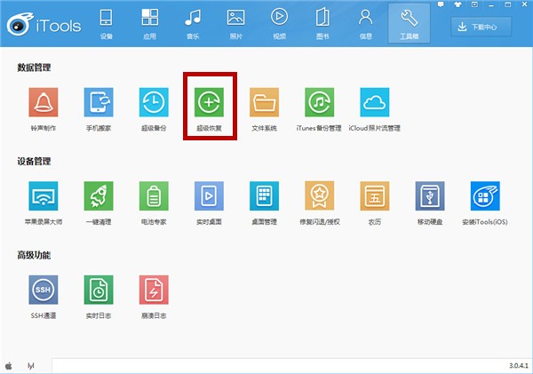 如果后期需要恢复备份文件,可以点击【工具箱】——【超级恢复】,如图,