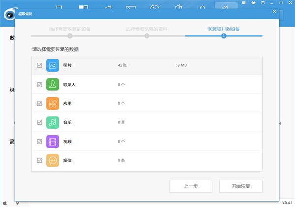 勾选需要恢复的数据,也可以选择全部恢复,点击【开始恢复】,