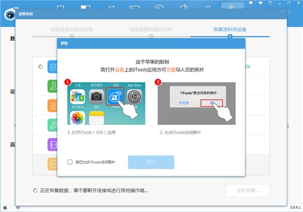 弹出提示,在iOS设备中打开iTools软件,允许访问照片,