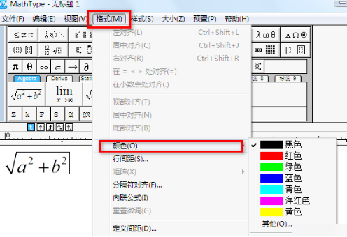 首先,我们要打开MathType公式编辑器进入工作主界面。在界面的菜单栏选择“格式”,在“格式”的子菜单点击“颜色”。
