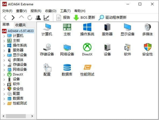 Aida64 Extreme Edition的简称是AIDA64,是目前最受欢迎的专业测试硬件、系统信息的一款软件。它可以查看电脑、主板、操作系统、设备等信息,还可以检测电脑安全、测试性能,它的操作界面有些像文件夹的打开界面,如下图: