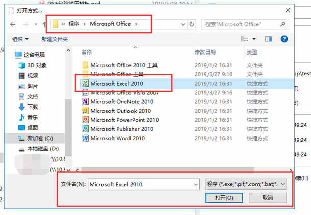 弹出对话框,找到Excel程序所在目录,选择Microsoft Excel 2010应用程序,点击打开,默认使用Microsoft Excel 2010打开DBF文件。