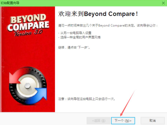 2、找到beyond compare路径后,用户需要将beyond compare软件打开,点击“下一个”的按钮,从而进入下一步的操作。