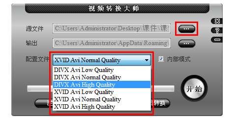 弹出视频转换窗口,点击【源文件】,导入需要处理的视频文件,设置文件输出路径,点击【配置文件】,可以选择高质量,