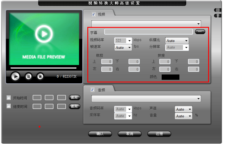 接着点击【高级设置】,进入窗口,在这里可以给视频添加字幕,设置视频码率、帧速率,还可以裁剪视频,