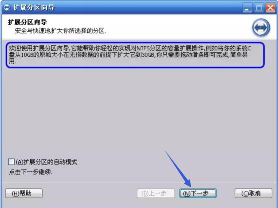 3、接着,在分区助手弹出的这个提醒对话框中简单阅读扩大C盘的说明,然后点击“下一步”按钮进入下一项操作。