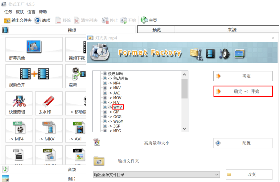 3、在弹出界面选择需要转换的格式,比如“WMV”,点击“确定-开始”,如图所示: