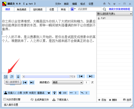 1、打开电脑上安装的“朗读女”软件,在文本内容选个位置插入背景音乐,如下图: