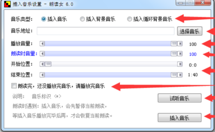2、在软件界面点击“插入朗读音乐”,设置插入的音乐,如下图: