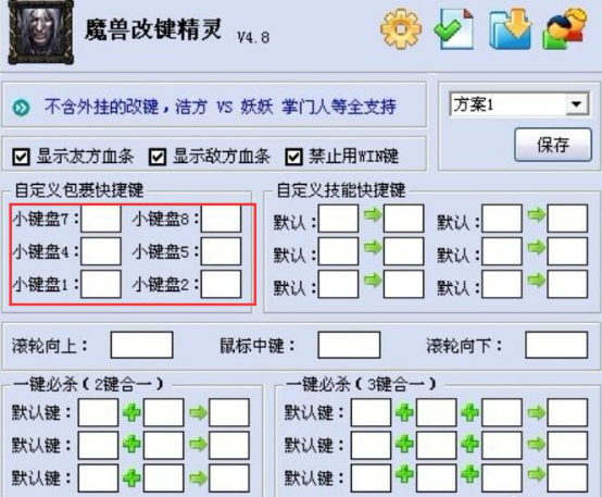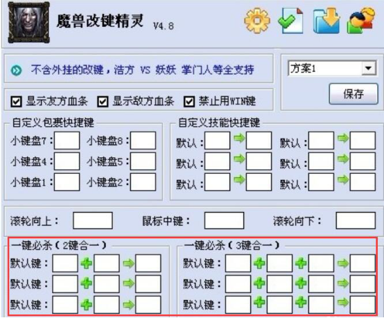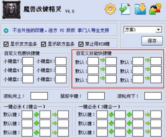 3、改键精灵使用的时候,会用到一些技能键。魔兽玩家可以根据自己操作键盘的实际需要对其进行设置,一般设置成自己双手惯用的键。