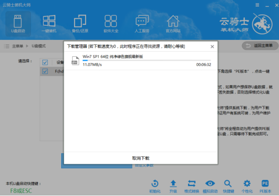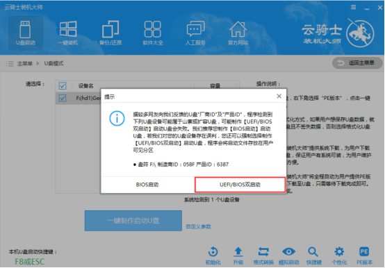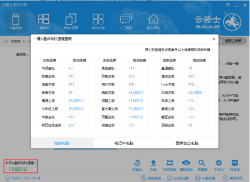 9、在电脑上插入U盘并按下快捷键(红色选框标注的部分)启动U盘以便“云骑士”确认U盘,如下图: