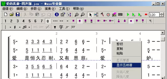 Muse不仅是极其好用的简谱排版软件,而且它对五线谱和吉他Tab谱的支持也很友好。咱们说说五线谱吧。举个方便快捷的例子吧。我已经有一首《爱的真谛》了,如下图。在“屏幕编辑”页签中,选中一个声部,右键,选择【显示五线谱】即可将一个声部转换成五线谱。