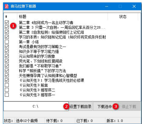 3、在弹出界面,勾选要下载的音频(记号①),在“设置下载位置”(记号②)输入存储路径,点击“下载选中”(记号③),下载开始,如下图: