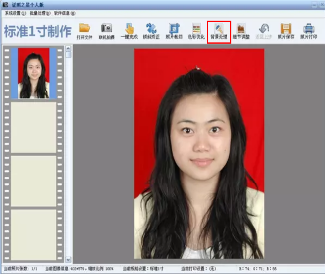 1、打开电脑上安装的“证照之星”软件,并将要更换背景色的照片导入到软件中,点击工具栏选项上“背景处理”,如下图: