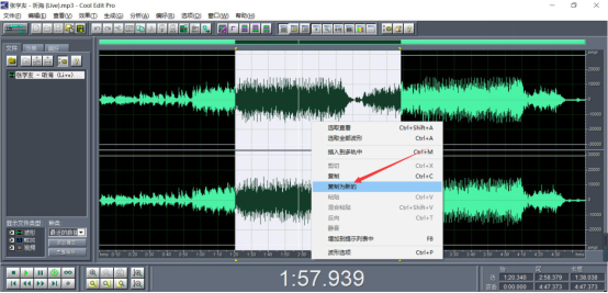 4、完成上一步操作后,选择需要剪辑的部分,鼠标右键单击图中的波形段,选择“复制为新的”。从而进入cool edit pro剪辑音乐的下一步操作。