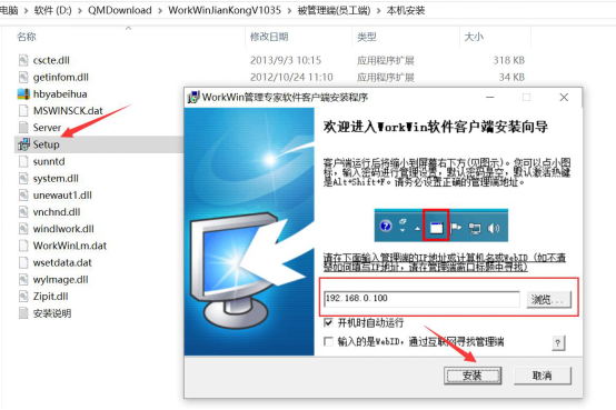 3、管理端Workwin设置完毕后即关闭。然后安装被管理端(员工端)Workwin。在上述第1步的解压安装包中找到被管理端的Workwin安装程序,点击进行安装。所弹出的Workwin安装程序窗口中,点击“浏览”选择管理端的地址,再点击“安装”即可完成。