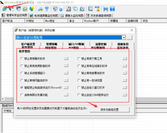 2、管理端Workwin安装后,点击主界面左上方的“设置”按钮,弹出客户端(被管理机器)系统设置的窗口。在此窗口的功能组中,可以发现Workwin可以对员工电脑进行流量控制、软件管控、网址管控等等,例如软件管控中,可根据企业自身需求勾选相关禁止项,让员工更专心工作,之后,点击“保存当前组设置”即可。