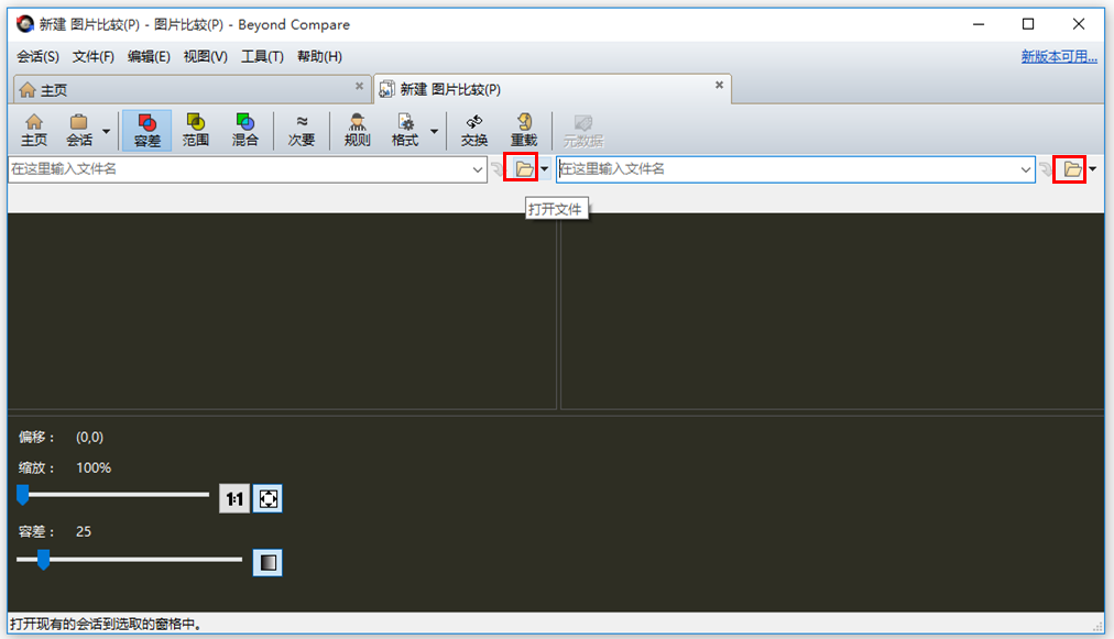 进入图片比较会话窗口,分别点击左右两侧的【打开文件】按钮,弹出对话框,选择需要比较的两张图片,