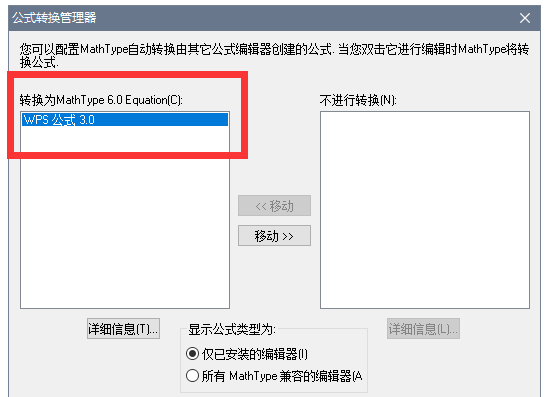 然后打开公式转换管理器,如图,在右边的【不进行转换】方框中显示的是WPS公式3.0,