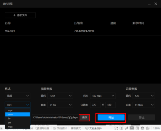 3、添加后,选择“格式”-“wmv”,默认存储路径即可,也可更改,点击“开始”,就可以转换视频格式了,如下图:
