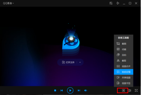 1、打开电脑上安装的“QQ影音”软件,在软件界面点击扳手图标,选择转码压缩,如下图: