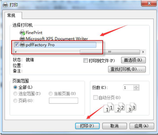 1、用户打开需要打印的单个文件,在打印窗口中选择pdfFactory,然后,点击窗口下方的“打印”按钮。