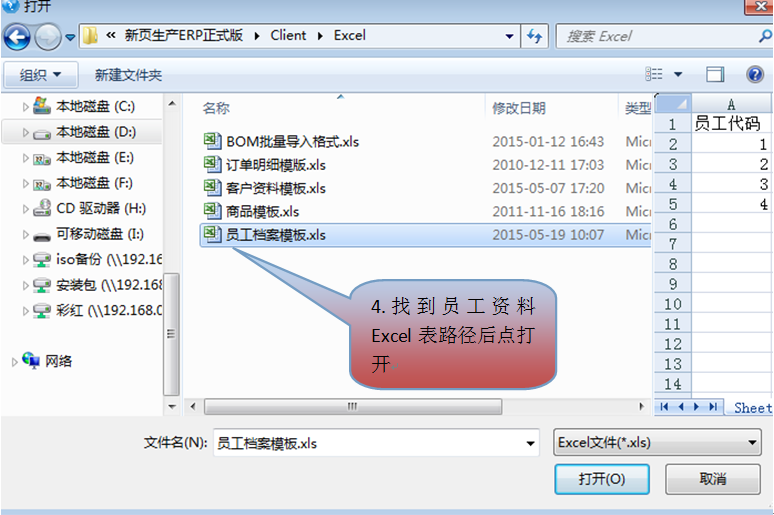 弹出对话框,选择导入模板,找到员工资料Excel表格,点击【打开】,