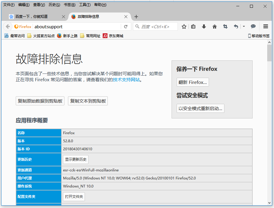进入界面,这里展示了一些技术信息,尽可能帮你解决某些问题;或者点击【翻新Firefox】、【以安全模式重新启动】,