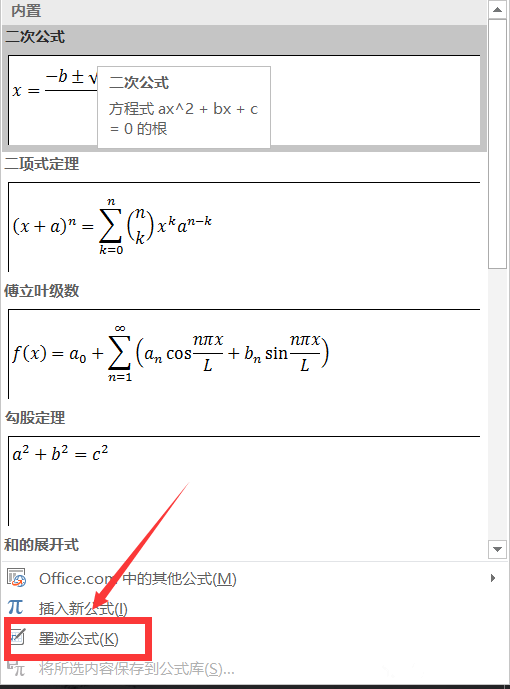 弹出下拉列表,选择墨迹公式,如图,