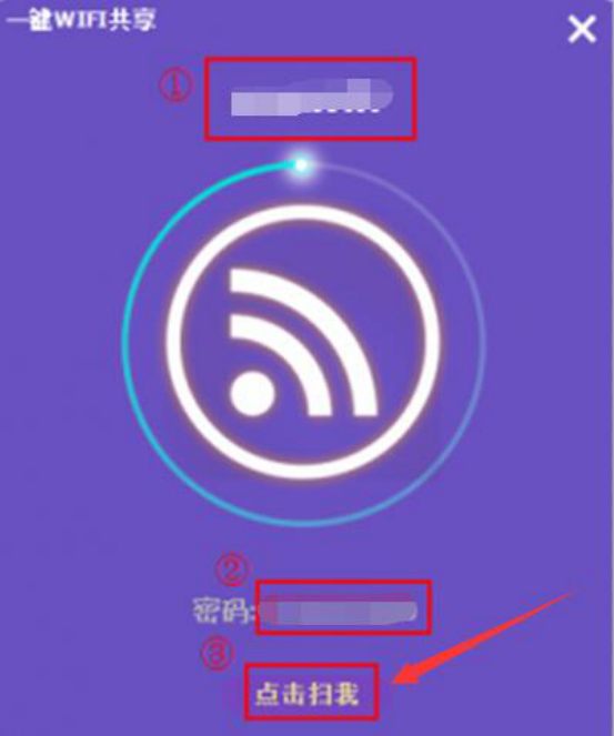 3、如果用户是小米的MIUI系统用户。在一键wifi共享的热点分享界面中,点击密码下方的“点击扫我”,将会出现wifi的二维码。此时,用户可以用MIUI系统自带的相机扫描,即可直接连接到一键wifi共享创建的wifi网络。