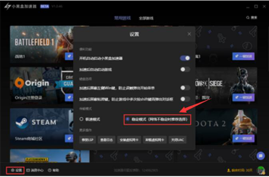 5、用户想快速解决网络延迟异常的情况,可以点击小黑盒加速器主界面左下方的“设置”按钮,在“设置”的对话框中勾选“稳定模式”和“开机自动启动小黑盒加速器”。