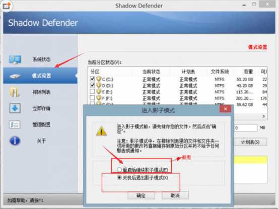 2、接着,用户在Shadow Defender“进入影子模式”的对话框中,勾选“重启后继续影模式”,并点击“确定”按钮,电脑的C盘便会一直处于影子保护下,也无需每次用户开机后都要重新设置。