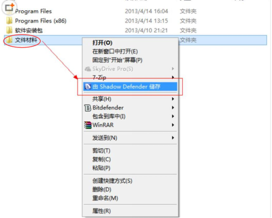 4、此外,如果用户想对文件资料进行储存,避免影子系统Shadow Defender将其消除,还可以选中该文件资料,然后鼠标右键,在菜单中,选择“由Shadow Defender储存”进行及时储存。
