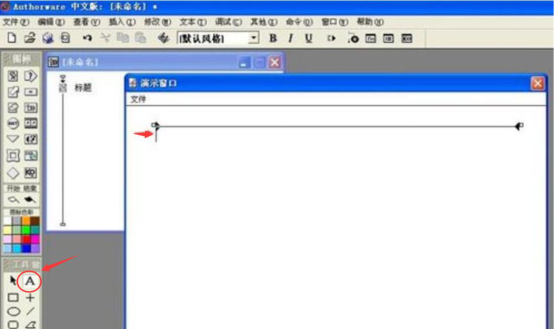 3、接下来会弹出演示窗口。单击authorware左侧工具栏的文本工具A,再将鼠标在演示窗口中点击一下,便会出现文本输入的光标提示,提示用户可以用authorware输入字符。