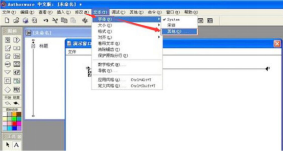 5、如果用户还想更改文本的字体模式,那么可以点击authorware菜单栏中“文本”中的“字体”,同样的,点击“其他”来选择自己所需要的字体即可。