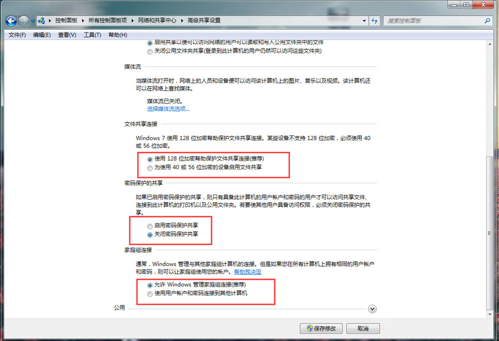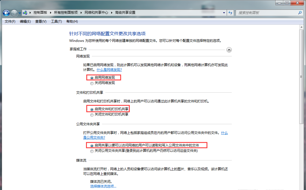 如图,依次勾选【启用网络发现】、【启用文件和打印机共享】,然后点击【公用文件夹共享】,自行决定是否勾选,