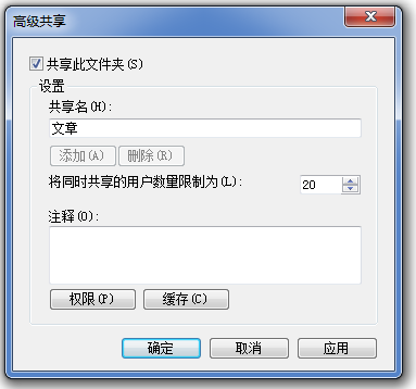 如图,点击【高级共享】,勾选【共享此文件夹】,设置共享名、共享用户数量,最后点击【应用】,进行确定。